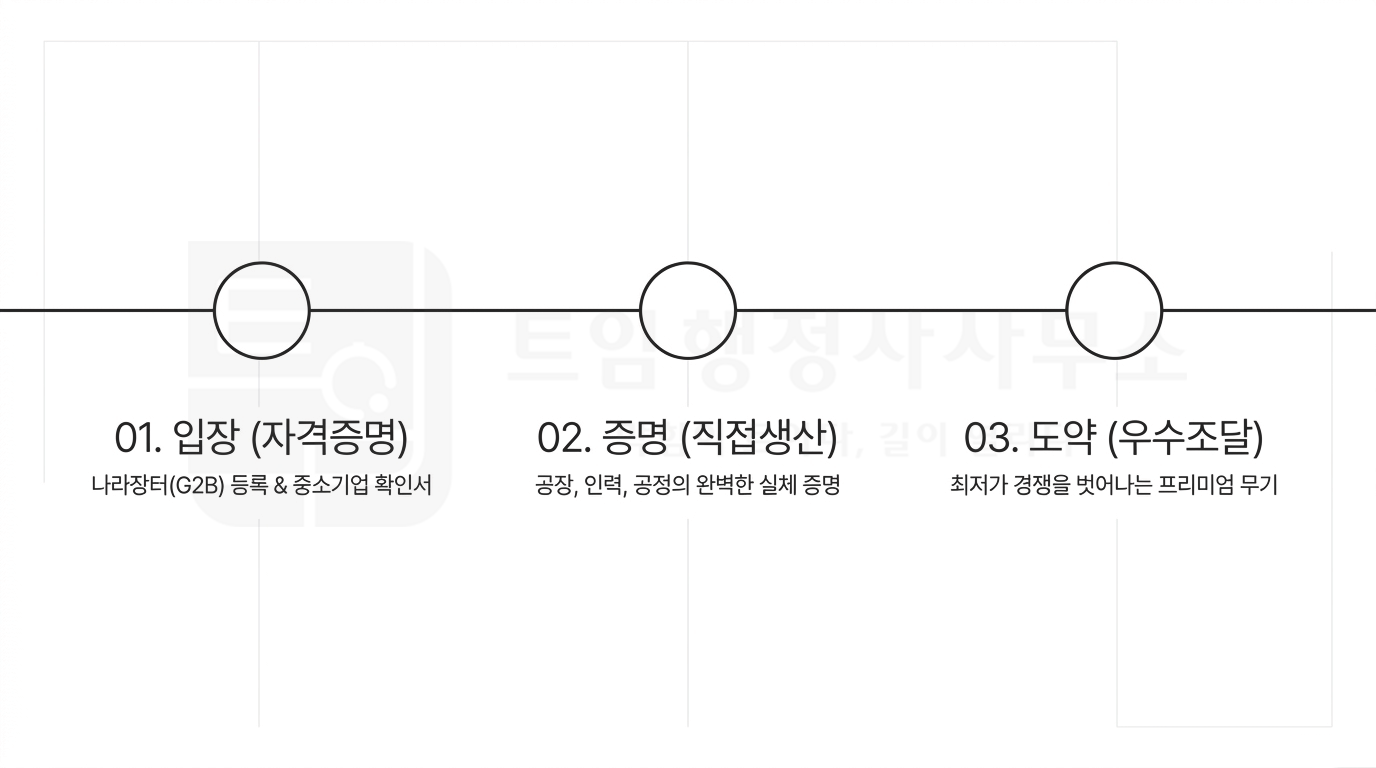 입찰참가자격과 중소기업 확인서 → 직접생산확인 → 우수조달물품 지정으로 이어지는 단계별 전략을 처음부터 설계하면, 2년 안에 안정적인 조달 매출을 확보하는 기업도 드물지 않습니다.