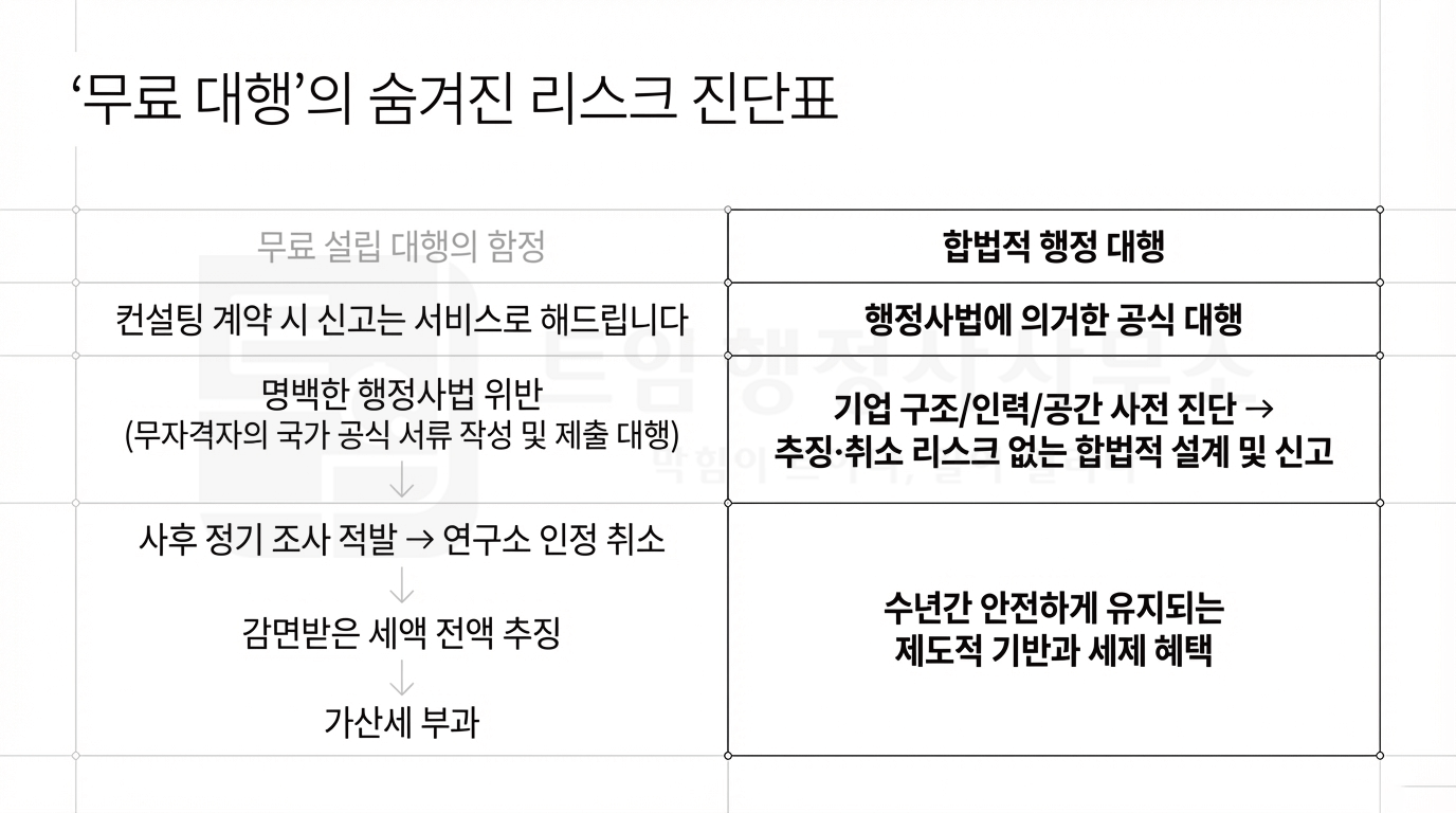 무자격 업체가 요건을 억지로 맞춰 신고한 연구소가 정기 조사·현장 실사에서 적발되면, 연구소 인정 취소 + 감면받은 세액 전액 추징 + 가산세 부과라는 타격이 한꺼번에 돌아옵니다.