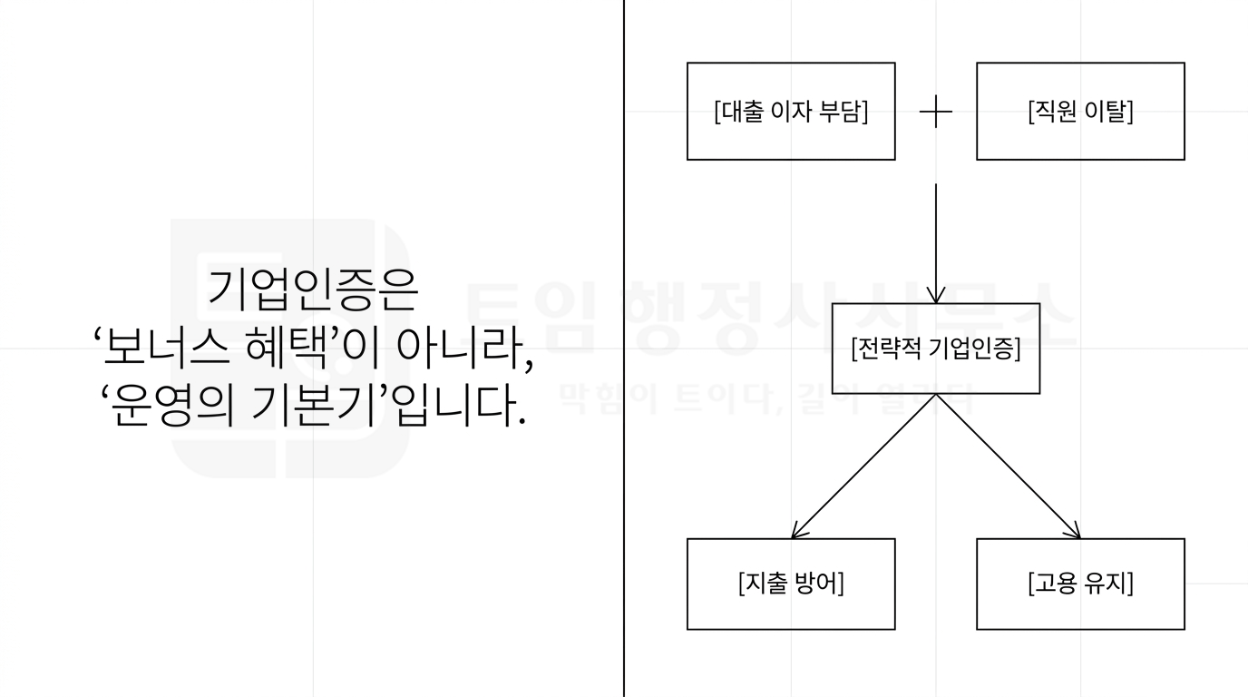 대출 이자 부담과 직원 이탈. 따로 풀기 어려운 이 두 문제가, 몇 장의 인증서 하나로 동시에 완화되는 경우가 적지 않습니다. 기업인증은 ‘보너스 혜택’의 영역이 아니라 ‘운영의 기본기’ 영역입니다.