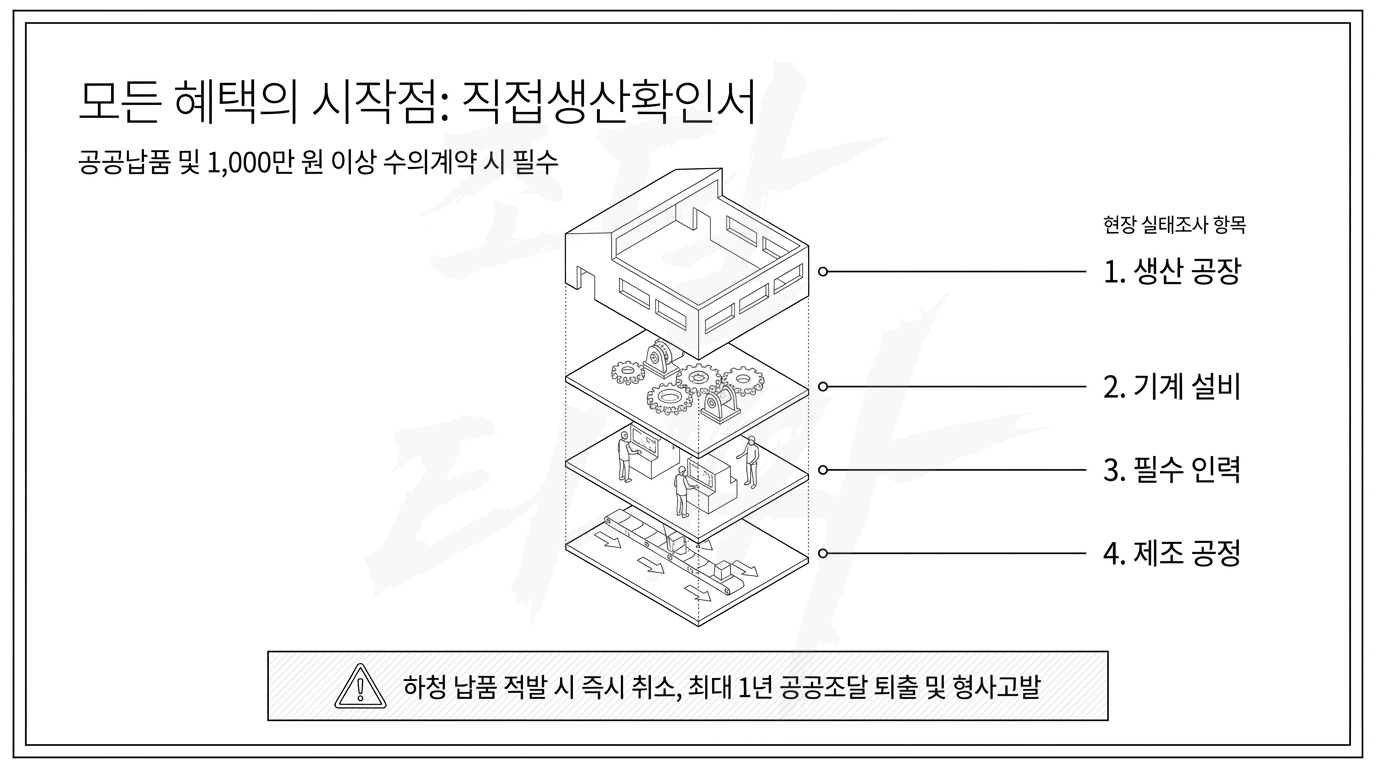 부정한 방법이나 하청 납품이 적발되면 직접생산확인서가 즉시 취소되고, 최대 1년간 공공조달 시장에서 퇴출되는 강력한 제재가 뒤따릅니다. 형사고발까지 이어질 수 있으므로 절대 가볍게 봐서는 안 됩니다.